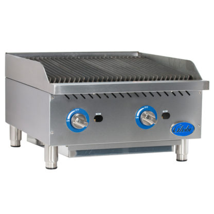 Gas Charbroiler, radiant, countertop, 24″ wide, heavy duty reversible cast-iron grates, (2) stainless steel U-style burners with stainless steel radiant covers, adjustable pilots with front access, stainless steel front edge, 4″ wide grease trough, stainless steel drip pan, insulated stainless steel double wall construction, metal control knobs with set screws, 4″ adjustable stainless steel legs, unit ships Natural Gas with LP conversion kit included, field convertible to char rock or combination radiant/char rock, 80,000 BTU, cETLus