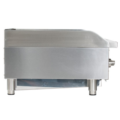 The Globe GCB24G-SR countertop charbroiler has insulated, double-walled front and sides constructed of quick-cleaning stainless steel. Its stainless steel front edge extends outward and is cool to the touch to prevent burns. Featuring a drip-flavor edge, the cast iron grates can be flat or angled to drain grease. A 4-inch drip tray catches grease and food particles and can be removed to dispose of them. The unit is kept level by 4-inch adjustable legs constructed of stainless steel.
