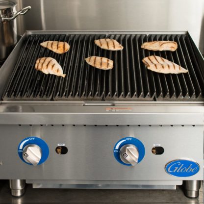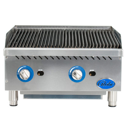 The Globe GCB24G-SR countertop charbroiler features two stainless steel, U-style burners with stainless steel radiant covers. Each of the burners has a pilot that is adjustable and accessible from the front panel. The burners heat every 6 inches and provide heat control every 12 inches, and the metal knobs on the front control panel are held in place by set screws.