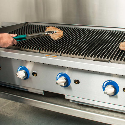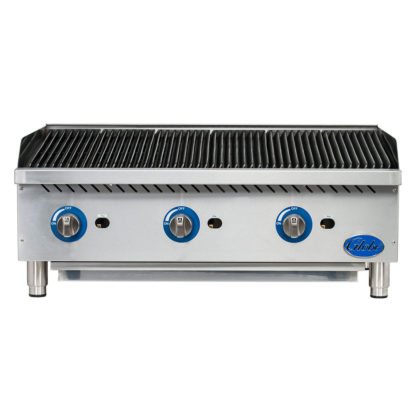 Gas Charbroiler, radiant, countertop, 36″ wide, heavy duty reversible cast-iron grates, (3) stainless steel U-style burners with stainless steel radiant covers, adjustable pilots with front access, stainless steel front edge, 4″ wide grease trough, stainless steel drip pan, insulated stainless steel double wall construction, metal control knobs with set screws, 4″ adjustable stainless steel legs, unit ships Natural Gas with LP conversion kit included, field convertible to char rock or combination radiant/char rock, 120,000 BTU, cETLus