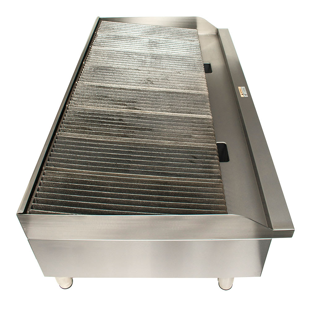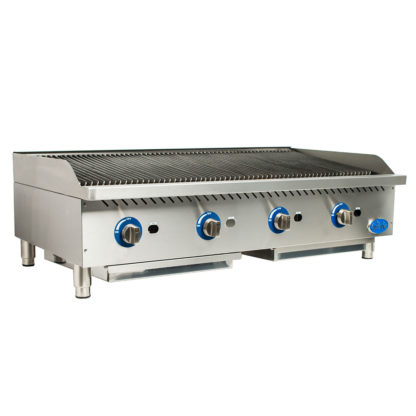 Gas Charbroiler, char rock, countertop, 48″ wide, heavy duty reversible cast-iron grates, (4) stainless steel U-style burners with cast-iron grids for holding rocks, adjustable pilots with front access, stainless steel front edge, 4″ wide grease trough, stainless steel drip pan, insulated stainless steel double wall construction, metal control knobs with set screws, 4″ adjustable stainless steel legs, unit ships Natural Gas with LP conversion kit included, field convertible to radiant or combination radiant/char rock (char rocks included), 160,000 BTU, cETLus