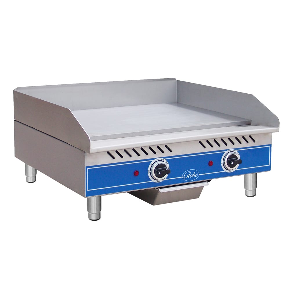 Cleaning the Globe GEG24 commercial electric griddle is easy; grease moves into the trough and debris falls into the catch tray. Back and side splash guards welded onto the unit prevent oil splashes on adjacent surfaces. Designed to fit on countertops, its 31/2-inch stainless steel adjustable feet account for uneven surfaces. Overall, it measures 24 inches wide, 21.7 inches deep, and 12.9 inches high.