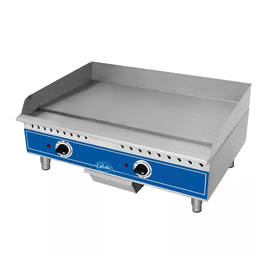 The Globe GEG24 electric griddle’s 1/2-inch-thick plate recovers heat quickly for spontaneous use. A thermostatic controller placed every 12 inches distributes uniform heat; the temperature is adjustable from 150 to 480 degrees Fahrenheit. With 24-inch-wide by 16.3-inch-deep cooking space, two foods can be cooked at the same time, increasing production. To protect the user, this unit’s stainless steel front edge is cool to the touch.