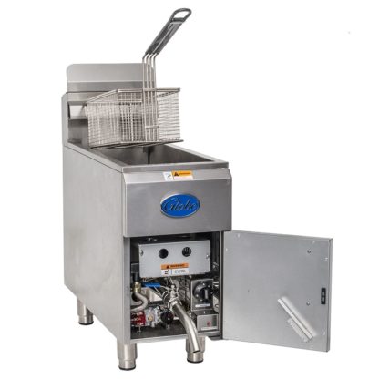 The Globe GF15G countertop fryer has a 15-pound oil capacity and cooks 20 to 25 pounds of fries in an hour. Heated by natural gas, the high-performance burners are made of strong stainless steel and recover heat quickly through snap-action thermostats. With high-limit protection, the power shuts off if the unit exceeds safe temperatures.