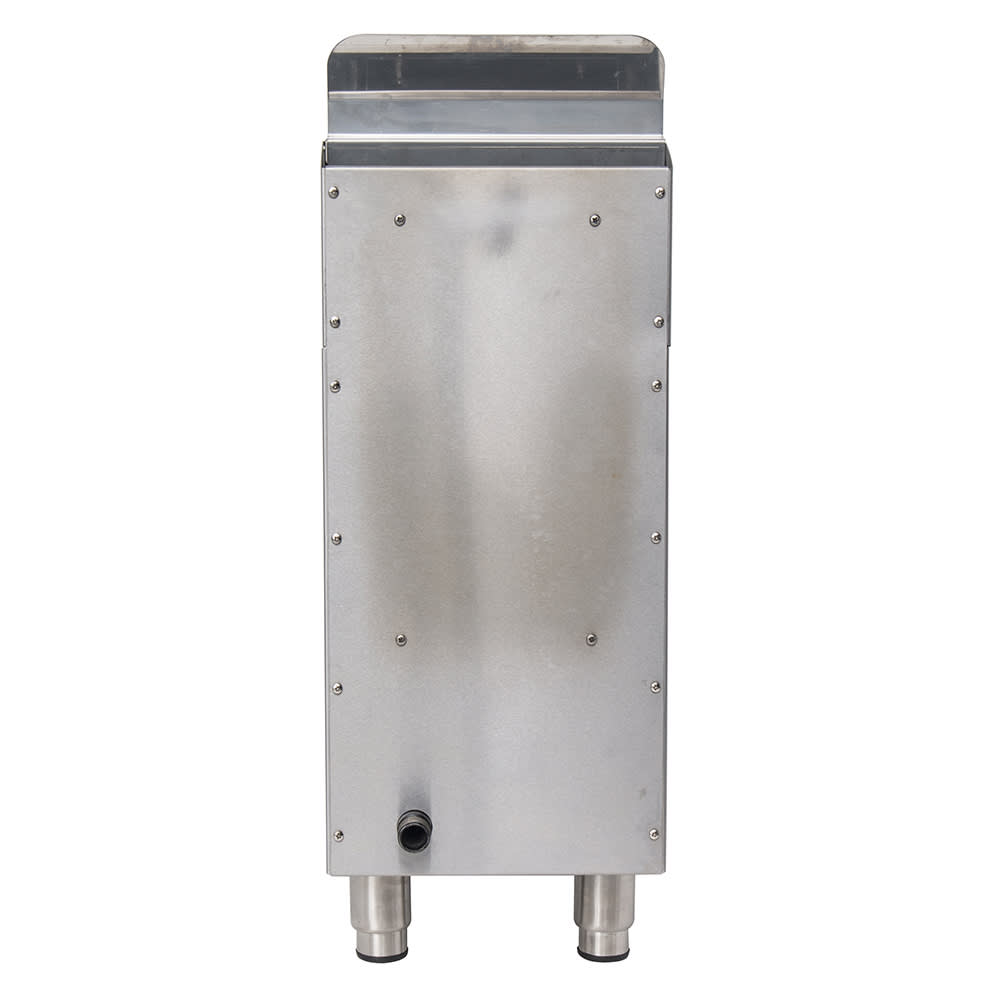 Fryer, Gas, Natural, countertop, single pot, 15-lbs. fat capacity, 13,250 BTU per burner, stainless steel construction, stainless steel fry pot with drain valve & extension pipe, (1) standard nickel-plated fry basket with insulated handle, stainless steel tube burners inside rectangular heat chambers, thermostat protection, 26,500 BTU, cETLus