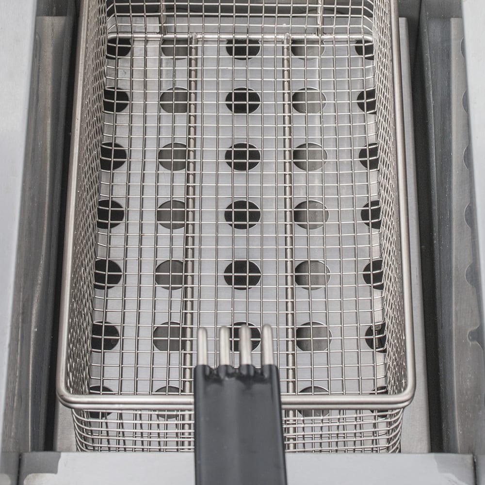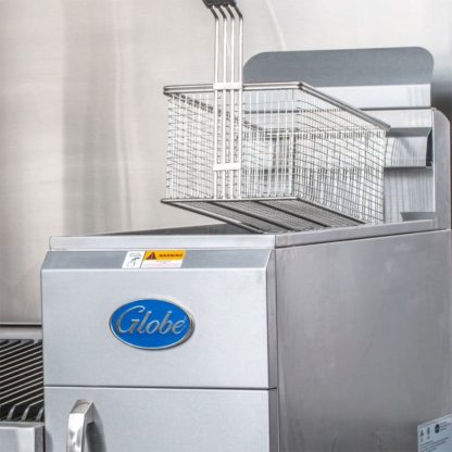 The nickel-plated fry basket includes an insulated handle that stays cool to the touch to protect users from burns. Built-in nesting grooves hold the basket after food has fried to drain oil. Most of the Globe GF15G gas fryer is made of stainless steel to enhance strength and facilitate cleanup, and its oil pan can be removed for quick disposal. Heat and fumes are sent into the exhaust hood by the flue deflector.