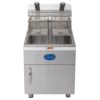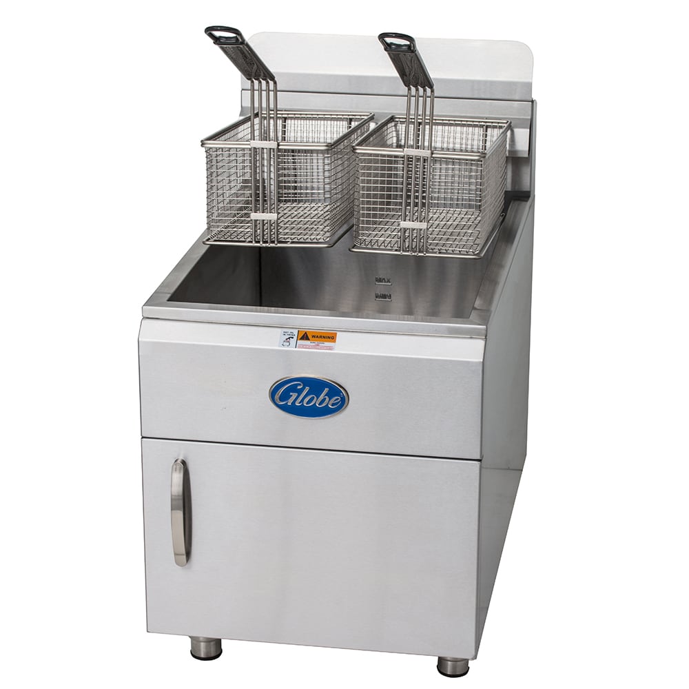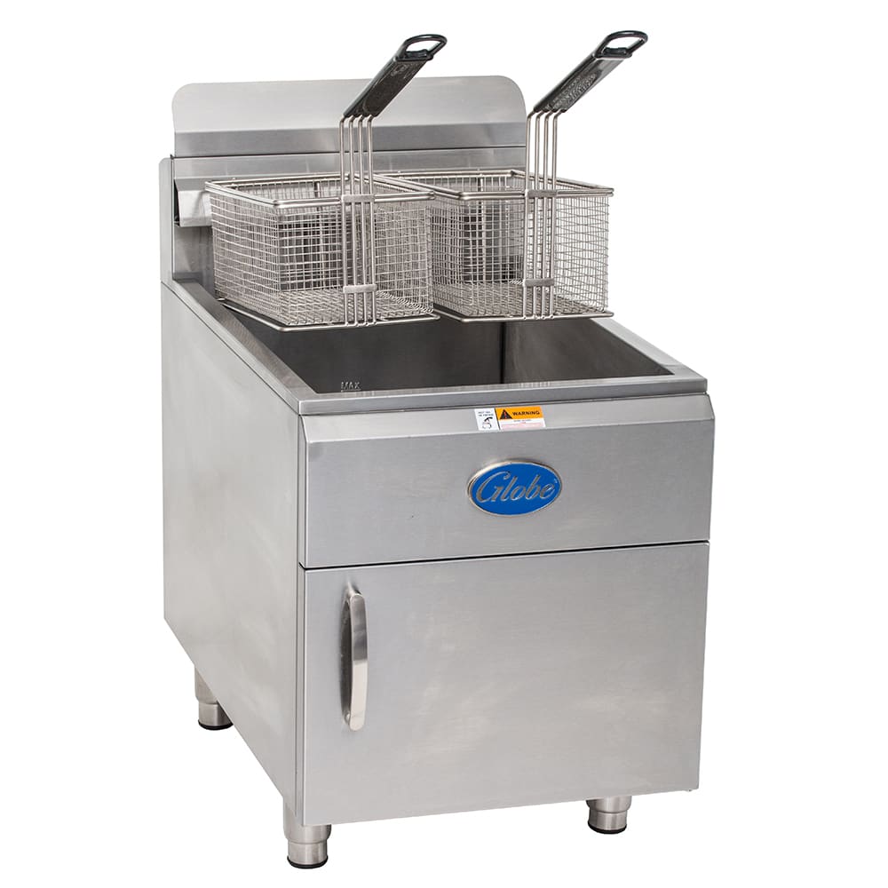 Constructed of stainless steel, the Globe GF30G gas fryer can withstand rigorous use without rusting, scratching, or denting. It’s designed with high-performance stainless steel tube burners, and it’s equipped with a removable oil pan to simplify cleaning. Enabling users to clean beneath it and stabilize it on uneven surfaces, this fryer is elevated on 4-inch legs. Overall, this unit measures 17 inches wide by 33.1 inches deep by 30 inches high.