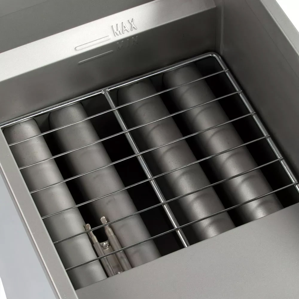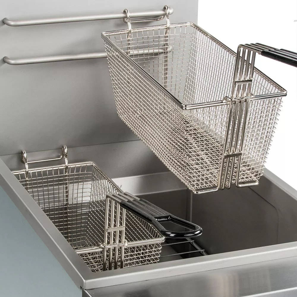 Holding as much as 50 pounds of oil, the fry tank in the Globe GFF50PG gas fryer is made of stainless steel that has been peened and welded. Because of its smooth finish, the tank does not have crevices that trap debris; instead, particles sink to the large cold zone to reduce carbonization that dirties the oil. Although it can be difficult to clean around the tube elements, the tank drain releases oil and sediment from the interior to streamline cleaning.