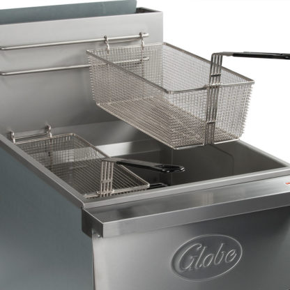 The Globe GFF80PG floor-model fryer is made for high-volume applications with its 80-pound oil capacity. Made of stainless steel, the tank is durable, and its welded construction helps prevent leaking. With a smooth finish, the welded areas will not trap sediment, enabling it to flow into the cold zone. In this area, the sediment is held at lower temperatures to prevent burning that can ruin oil quality. This Globe GFF80PG gas fryer operates between 200 and 400 degrees Fahrenheit with a millivolt thermostat and gas valve.