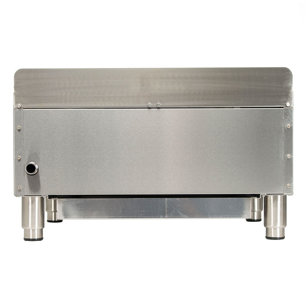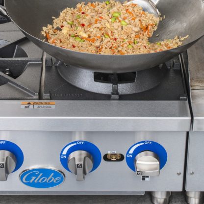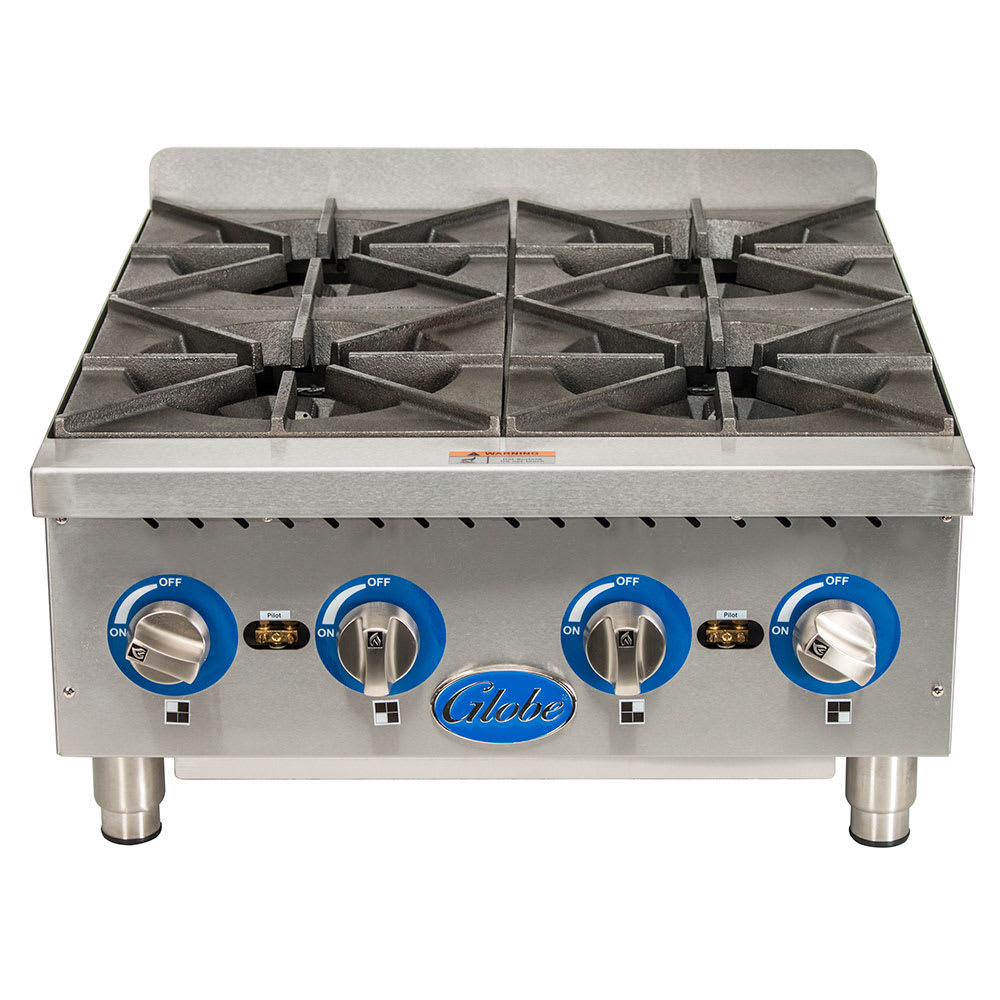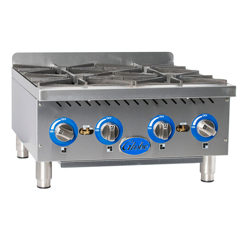 The Globe GHP24G gas hot plate has four high-performance burners that ignite with adjustable pilots and can be controlled with metal knobs. Cast-iron burners and grates support heavy use, and a cool-to-the-touch front edge separates operators from the surface. The Globe GHP24G gas hot plate has a removable catch tray that contains food particles.