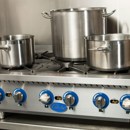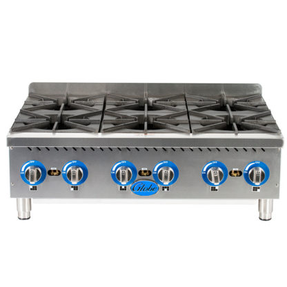 Six cast iron burners provide heat on the Globe GHP36G gas hot plate. Accessible on the front, the adjustable pilots have metal knobs to control heat level. To protect the operator against burns, the front edge remains cool to the touch. A removable, stainless steel catch tray simplifies the cleaning process, while four adjustable legs elevate the Globe GHP36G gas hot plate off uneven countertops.