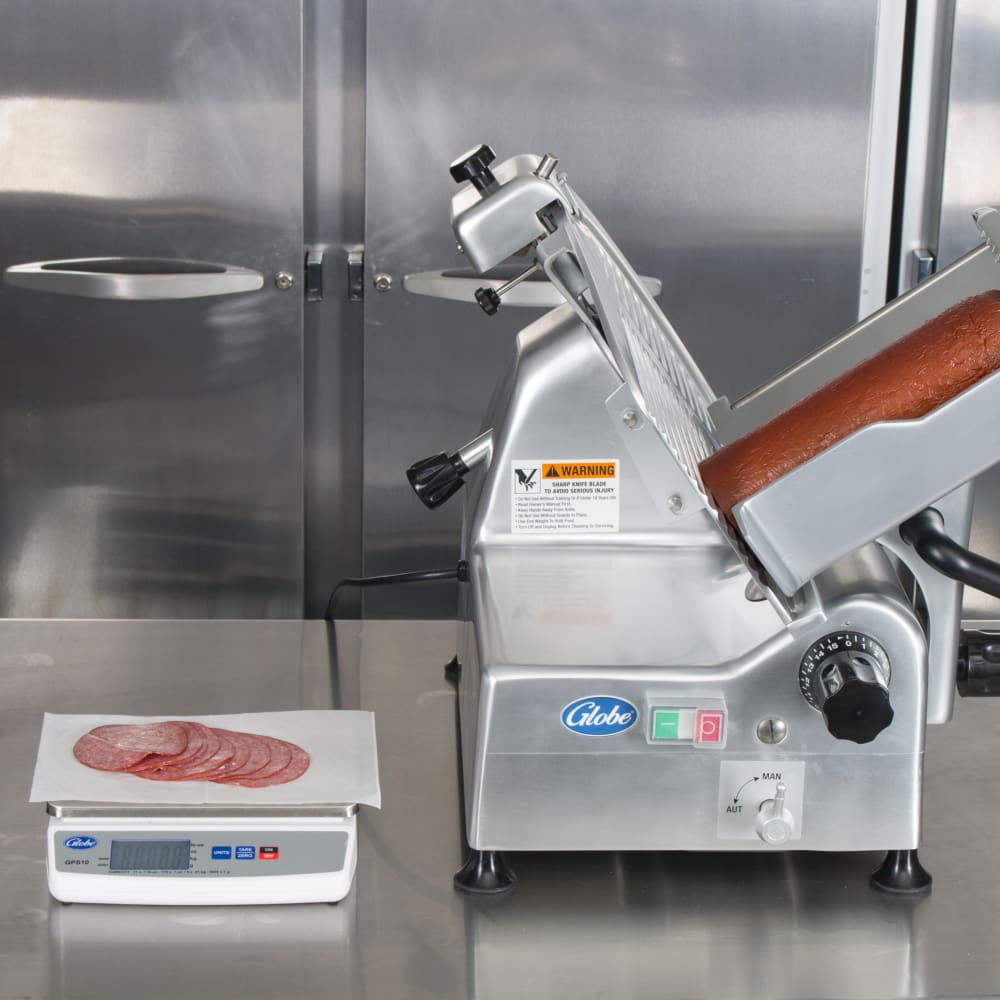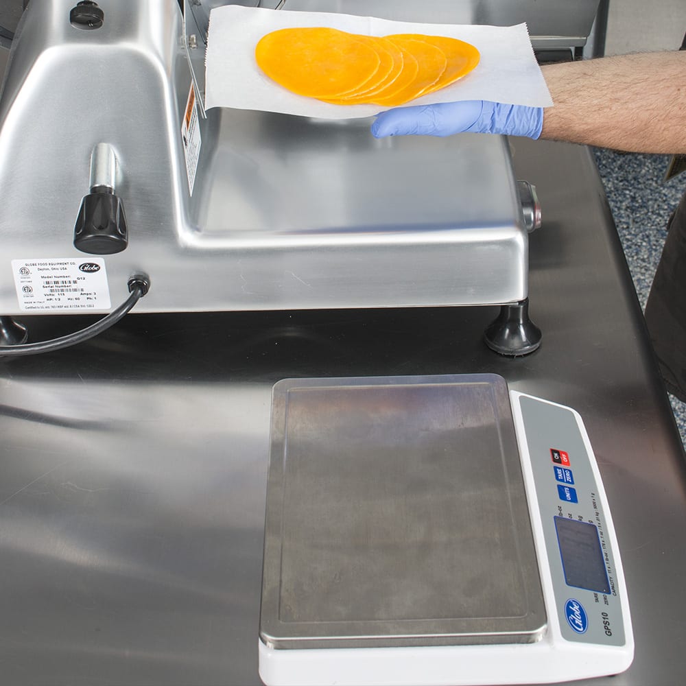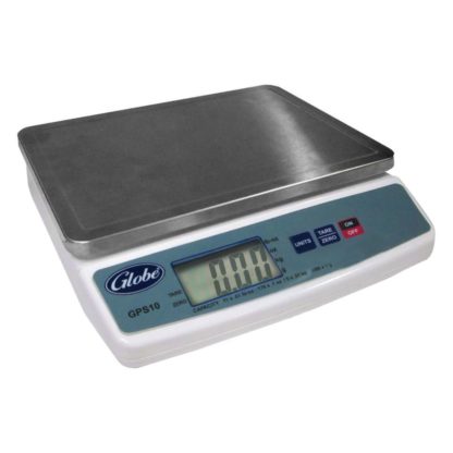 The Globe GPS10 portion control scale can weigh products in pounds-ounces, ounces, kilograms, or grams and can accurately weigh loads up to 10 pounds. A simple zero-tare button makes it easy to remove the weight of your container from the total weight or weigh ingredients one at a time in the same container. The scale’s hygienic stainless steel platform measures 9 inches by 7 inches and is fully removable and dishwasher safe. The Globe GPS10 scale can be powered by either the included AC adapter or two “C” batteries.