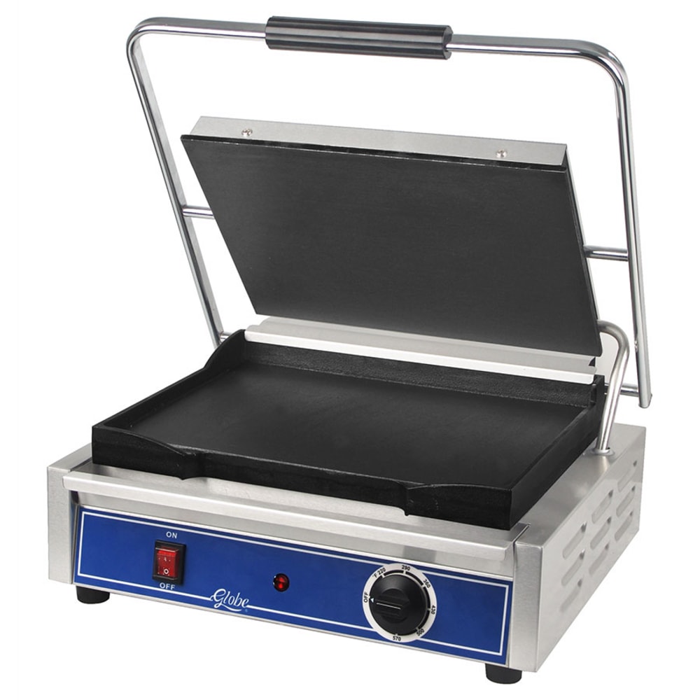 The Globe GSG1410 panini press features two smooth plates made of seasoned cast iron. Although these plates do not create grill marks, they also do not have food-trapping grooves and are simple to clean. Durability is fostered by the stainless steel body, which resists denting and rusting. The stainless steel tray catches grease and food particles during cooking and can be removed for cleaning.