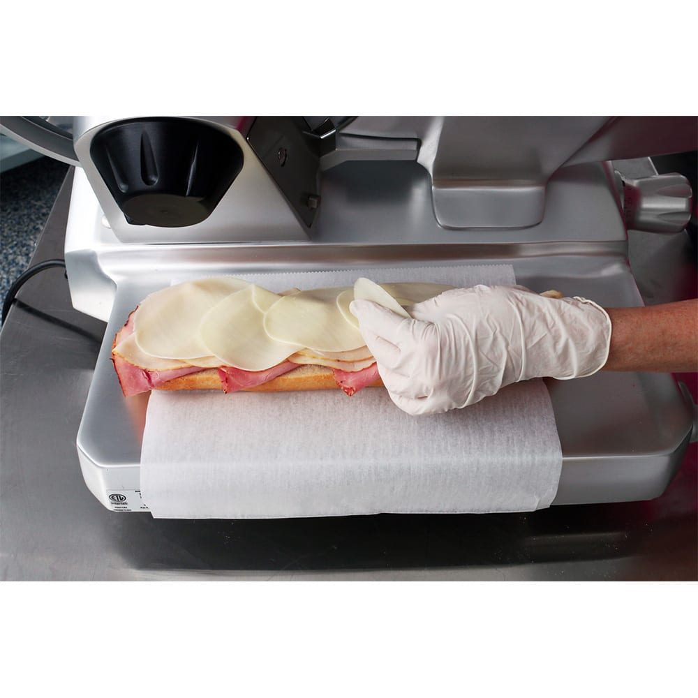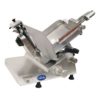 Using a 0.4-horsepower motor, the Globe GSO12 manual slicer features a belt-driven design, and it’s equipped with nonslip rubber feet to prevent sliding if bumped. If it turns off from a power outage, it won’t randomly power on as it has a no-volt-release mechanism. Designed to fit on a countertop, the anodized aluminum unit sports an open-style body that’s 22.5 inches wide by 27 inches deep by 20.5 inches high. Users can easily clean underneath the knife due to its large clearance, and its table can be adjusted for sanitation.