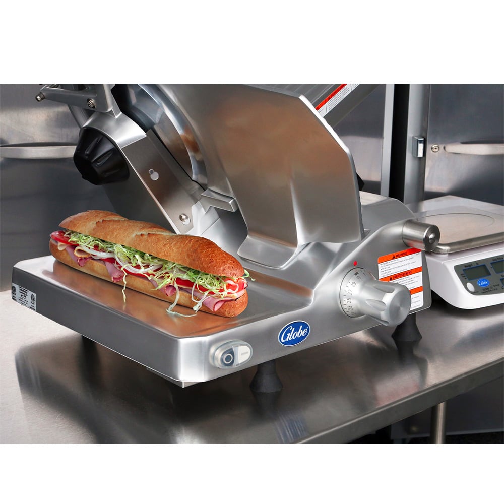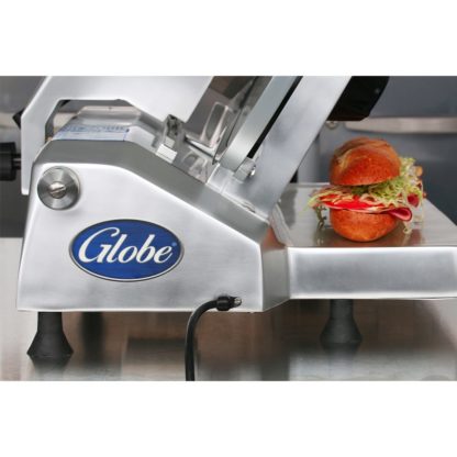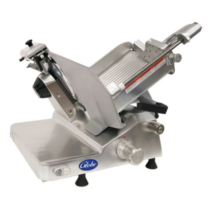 Globe Food Slicer, manual, 12″ diameter knife, 0″ to 1-1/16″ slice thickness, removable gravity feed food chute, food fence, top mounted sharpener, slice deflector and knife cover, belt-driven, anodized aluminum, rubber feet, 2/5 HP, 120v/60/1, 3.5 amps, NEMA 5-15P, cETLus, ETL-Sanitation