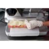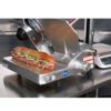 The Globe GSO12 open-body manual slicer can cut foods as large as 5.5 inches long, 11 inches wide, and 8 inches in diameter. Catering to different needs, the slicer’s maximum slice thickness is 11/16 inches. Its 12-inch carbon steel knife is durable enough to endure impact from thick foods, and when it becomes dull, it can be filed with the sharpener, which is mounted on top of the slicer. Users can easily load and unload ingredients on the unit without it tilting; it has a heavy front-mounted end weight to balance the machine.