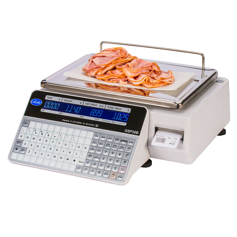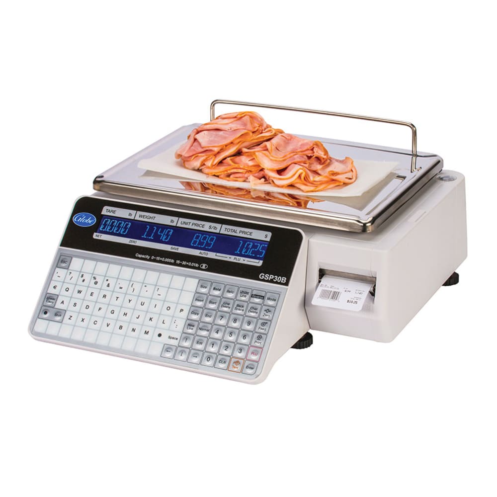 Designed to accurately weigh and calculate the price of product, the Globe GSP30B legal for trade scale has a dual-sided display so the customer and operator can both read the weight. It has a built-in label system that can print on standard or safe-handling labels, and it can be hooked up to a price look-up system to upload codes for each item. Each label will show the product name with a description, packaged date, sell-by date, unit price, total price, tare, weight, PLU number, bar code, store name and address, and a logo. For immediate use, a roll of labels is included with the scale, which has a 30-pound capacity and weighs in 0.01-pound increments.