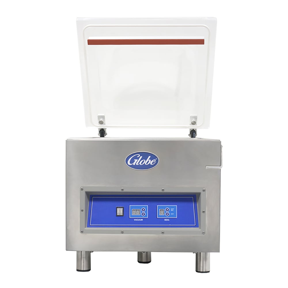 Create a secure seal perfect for sous vide cooking with this Globe GVP20 chamber vacuum packaging machine with 16 1/2″ seal bar and oil pump! This unit seals food in as little as 4 seconds and vacuums in 50 seconds, saving you time and providing an efficient solution your kitchen needs. To ensure the product is in line with the sealing bar, this vacuum sealer includes an elevation platform to align the two, creating a perfect seal for each use. If you want to stop and seal the product before the end of the cycle, this unit features a Stop & Seal button that pauses the vacuum cycle and allows you to finish sealing the product. If you want to stop the cycle altogether, a conveniently located “Stop” button provides this functionality, allowing the operator maximum control over the vacuum sealing process to produce the best results.