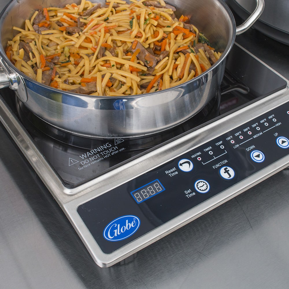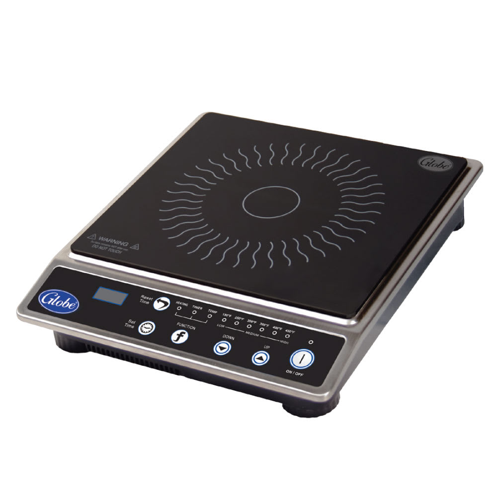 The Globe IR1800 countertop induction cooktop operates at six levels from 150 to 450 degrees Fahrenheit, while a four-digit LED display highlights the operating levels. An adjustable cooking surface suits cookware from 4.75 inches to 9.5 inches diameter. Automatic pan detection senses when induction-ready pots and pans are placed on the ceramic cooktop, and the unit automatically shuts off when the 170-minute timer expires. To protect the Globe IR1800 countertop induction cooktop, the over-heat protection shuts off power if the pan or electrical components overheat.