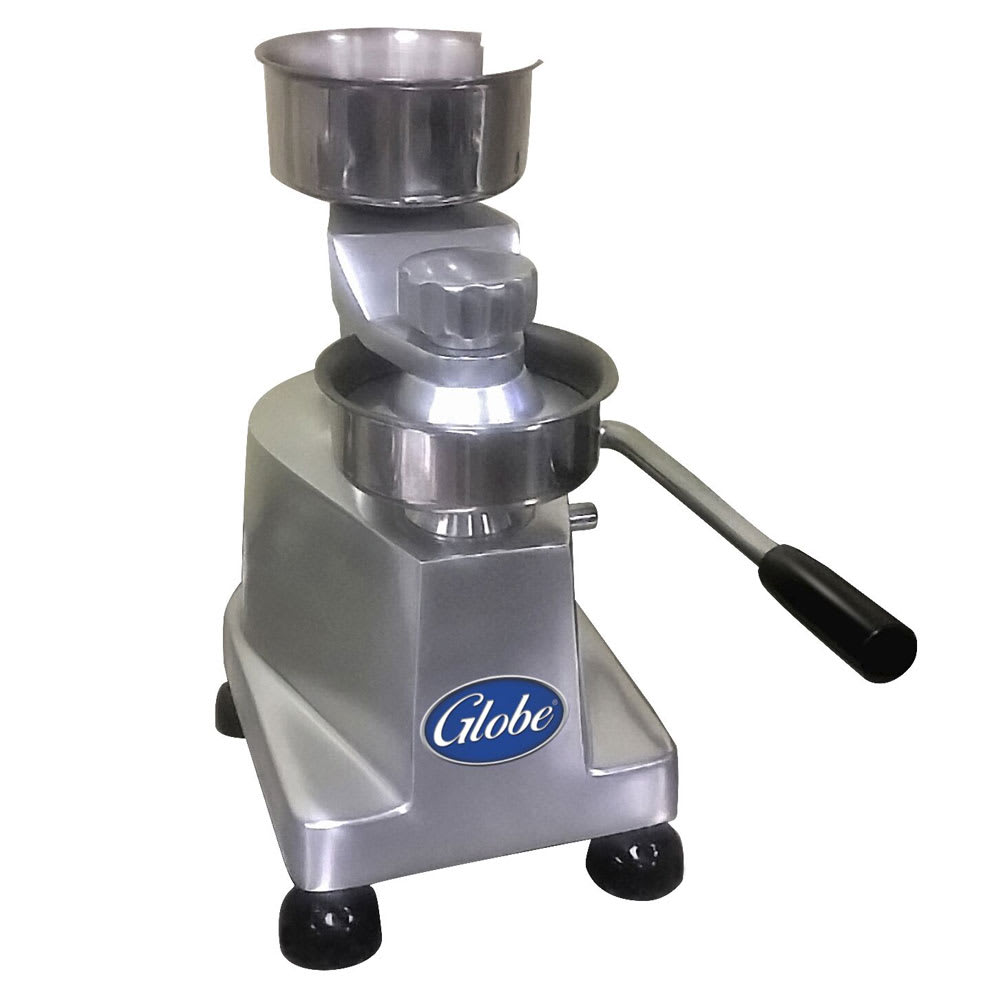 The Globe PP4 Patty Press burger mold is great for sports pubs and burger joints that grill and serve hamburgers. This press forms 4-inch patties-an excellent overall burger size that weighs 4 to 6 ounces. It has a stainless steel bowl that offers good defense against scratches, scraping, and rust.