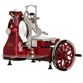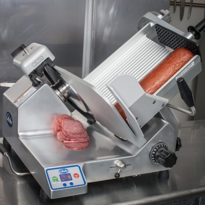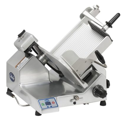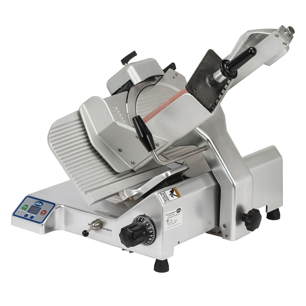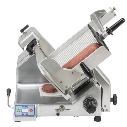 Premium Heavy Duty Advanced Slicer, automatic, 13″ knife, (4) speeds, (3) stroke lengths, LCD display, top mounted sharpener with synthetic diamond surfaces, knife cover interlock, home start, return to home, close to stop, interlocked tilting carriage, auto off, four-hour cleaning timer, lift lever, seamless anodized aluminum base, 1/2 HP knife motor, 115/60/1-ph, 2.5 amps, NEMA 5-15P, cETLus (Made in USA) (Replaces 4795N)