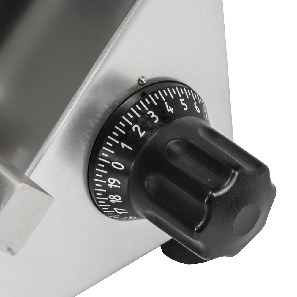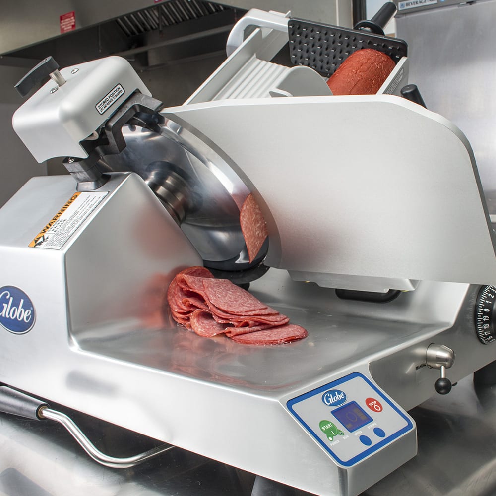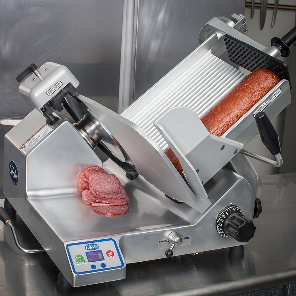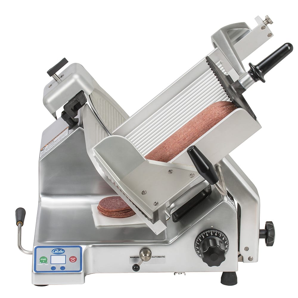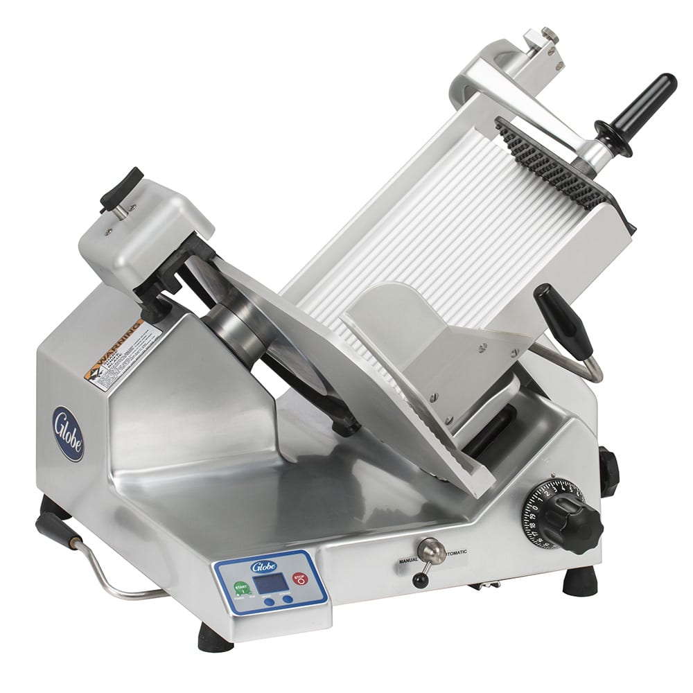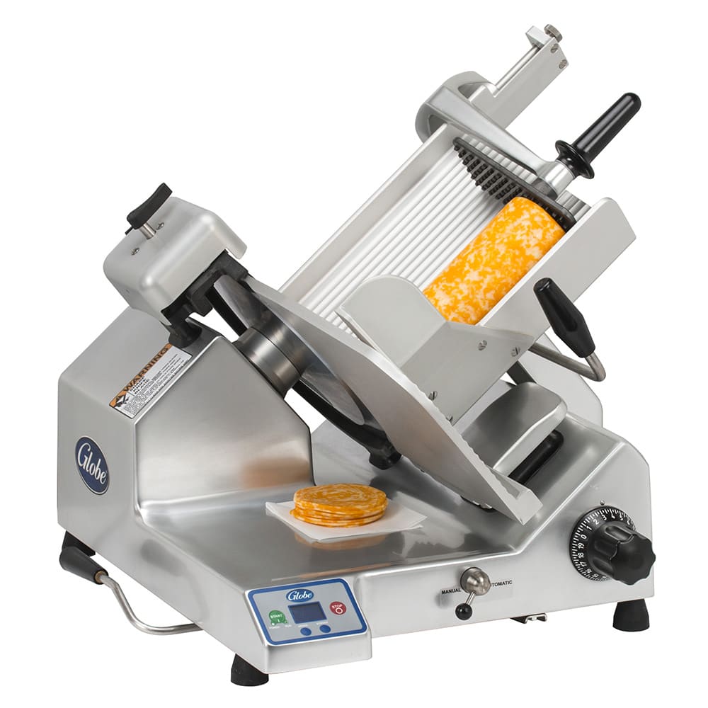 The 13-inch blade on the Globe SG13A automatic slicer has three stroke lengths and four speeds. The unit is suitable for slicing an unlimited amount of food throughout the day, including cheese. The slicer can be adjusted to produce a slice thickness of up to 11/8 inch. This advanced slicer has a shielding knife cover interlock system to protect the operator. The return to home feature returns the carriage to the starting position when the motor is shut down.