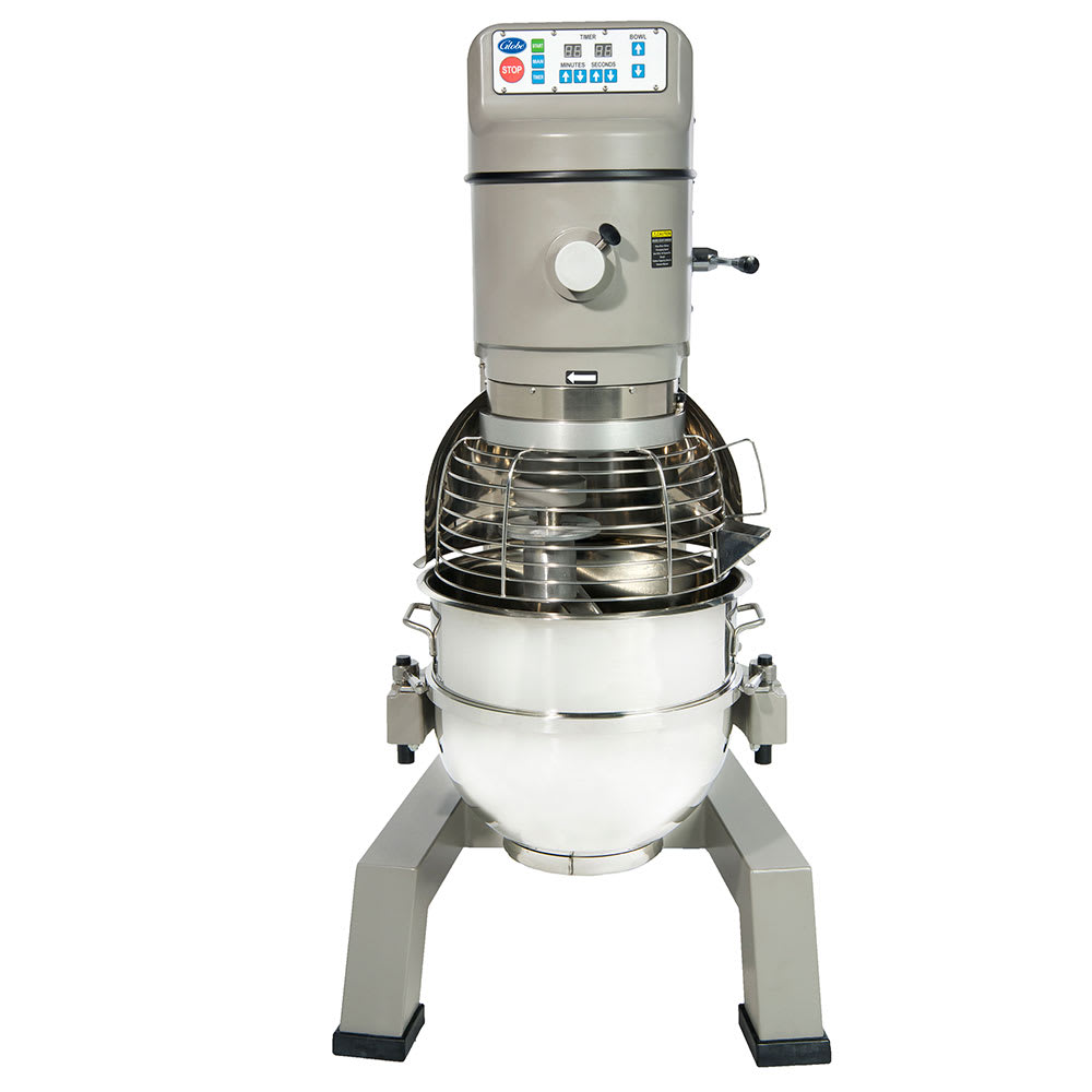 The attachments included with the Globe SP62P-4 planetary pizza mixer are an aluminum spiral dough hook, a flat beater, and a stainless steel whip. The 60-quart stainless steel bowl is large and requires a power lift to move it into place on the mixer. To move the bowl, it should be placed on the heavy-duty bowl truck to reduce physical strain on operators. The mixer has four fixed speeds and features a control pad on the front equipped with a 60-minute digital timer and a last-batch recall feature.