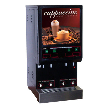 GRINDMASTER GB Hot Powder Cappuccino Dispenser, electric, low to medium volume, (4) 4 lbs capacity hoppers, direct drive auger, power whip, vacuum steam removal system, self-cleaning system, 3.75 gallon capacity water tank, illuminated door with right hinge, black exterior, cULus, NSF, 120v/60/1ph