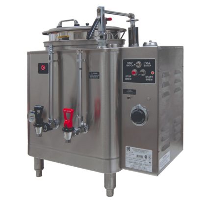 GRINDMASTER AMW Midline Heat Exchange Coffee Urn, single, electric, (1) 6 gallon capacity liner, fresh water heat exchange style brewing system, Teflon coated spray arm, automatic refill, automatic coffee agitation, half/full batch capability, low water cutoff system, side mounted control panel, single wall insulation, 304 stainless steel construction with satin finish, UL, cCSAus, NSF, 120/208v/60/1ph
