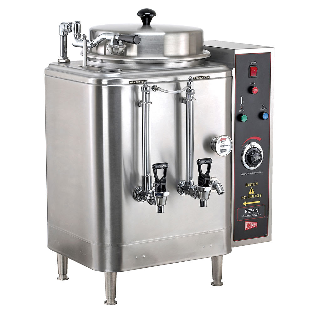 The 3-gallon Grindmaster FE75N low-volume brewer coffee urn keeps product hot constantly and displays temperatures on its front thermometer. This automatic, stainless steel machine uses a push-to-start agitator and an automatic refilling system when water volumes are low. For safety purposes, the overflow tube dispenses excess water if the shut-off valve malfunctions and a cycle-stop switch can be used to stop coffee flow midstream. To adjust coffee strength and achieve a more natural taste, this unit has an adjustable bypass system that operators can control.