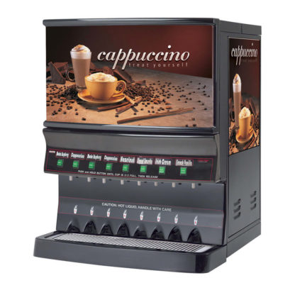 GRINDMASTER GB Hot Powder Cappuccino Dispenser, electric, high volume, (1) 10 lbs capacity hopper & (7) 5 lbs capacity hoppers, direct drive auger, power whip, vacuum steam removal system, self-cleaning system, 7.4 gallon capacity water tank, illuminated vertical lift door, black exterior, UL, NSF, 120v/60/1ph