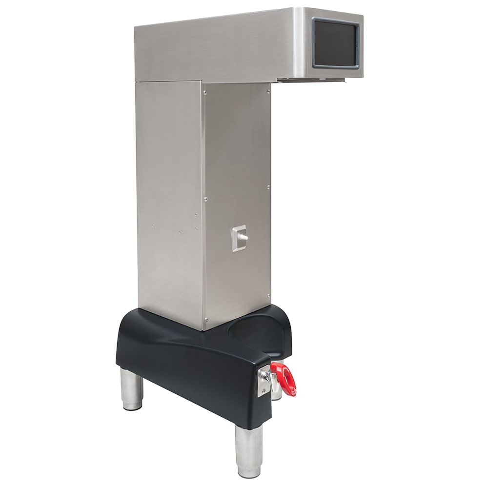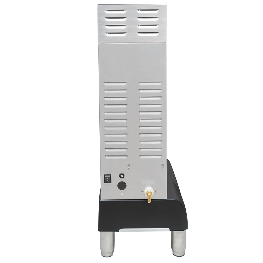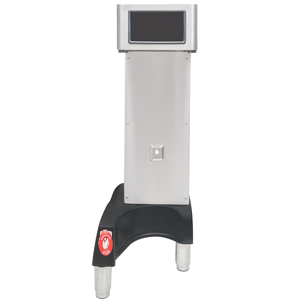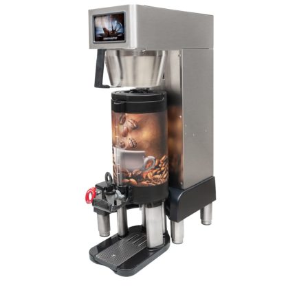 With its 3.2-gallon heating tank, the Grindmaster PBC-1VS Vacuum Shuttle coffee brewer prepares coffee for remote service by brewing it into a portable, vacuum-insulated shuttle. This shuttle can be transported elsewhere to hold coffee as it is served, and sensors detect if the shuttle is absent, stopping the machine from brewing. The brewer has a digital interface with touchscreen controls, so users can input their desired settings and commence the brewing cycle.
