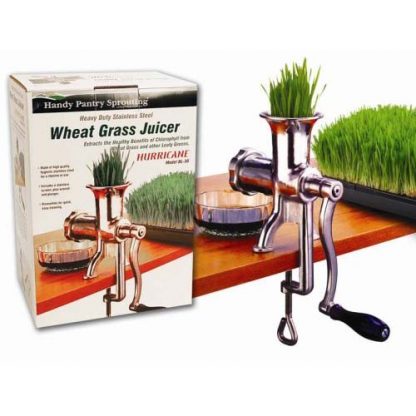 The hurricane wheatgrass juicer is our flagship hand crank / manual juicer and hands down the best manual juicer on the planet. The Hurricane Juicer is built to last because the juicer is stainless steel, it will never rust and it is very easy to clean up and is dishwasher safe. We love the Hurricane because of the efficient juicing design. Once you put a handful of wheat grass or barley grass into the feed spout it almost immediately starts juicing, and the ejected pulp is surprisingly dry. It really gets the juice out. By far our most popular manual juicer.