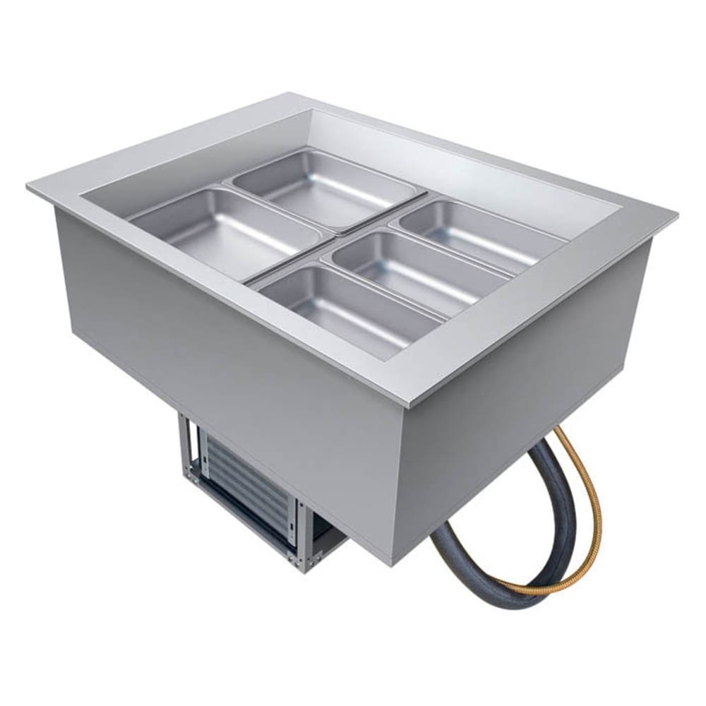 Drop-In Refrigerated Well, (2) pan size, top mount, electronic temperature control, pan support bars for full-size pans, condenser unit (can be rotated), sight glass, service valves, dryer/filter, insulated with drain, aluminized steel housing, stainless steel bezel, 1/4hp, 120v/60/1-ph, NEMA 5-15P, cULus, Made in USA