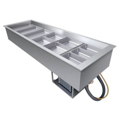 The Hatco CWB-6 drop-in refrigerated well’s condensing unit operates with R-513A refrigerant so prechilled foods are displayed in a food-safe environment. Its angled interior wall allows cool air to blanket the displayed food pans for uniform cooling, while its eco-friendly insulation preserves generated chill in warm settings, reducing energy loss. So operators can adjust the unit’s temperatures as needed, it’s equipped with an advanced electronic controller that can be installed remotely or on either side of the condensing unit. To preserve product quality and maintain a clean display, these controls also feature an automatic defrost. This well is built with a sight glass, service valves, a dryer/filter, a receiver to ease maintenance, and its long, flexible refrigerant line can pull out the condensing unit for convenient access.