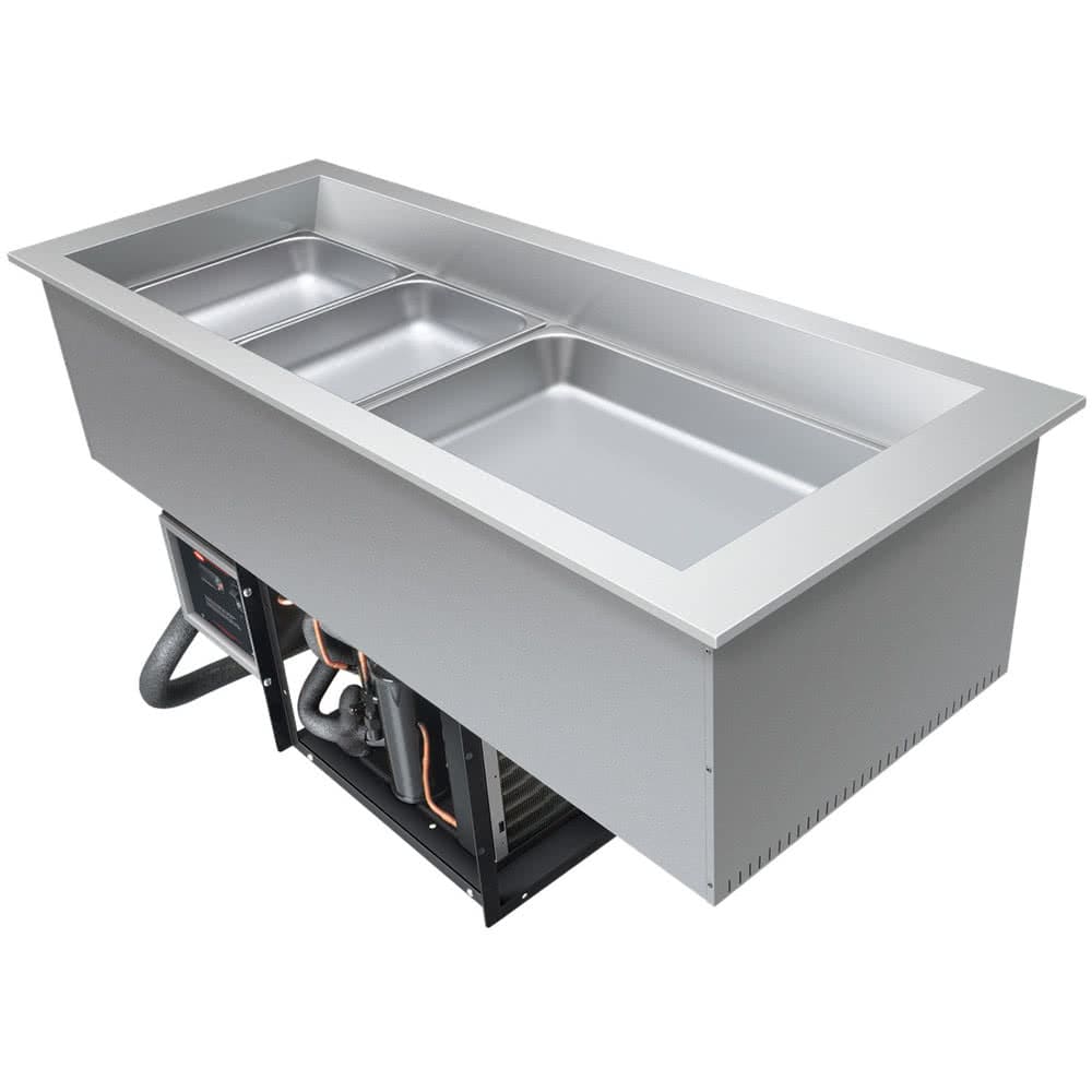 With its slim size and drop-in configuration, the Hatco CWB-S2 refrigerated cold well enhances accessibility and creates a sleek, streamlined appearance in food bars. This 4813/100-inch-wide by 1847/50-inch-deep by 261/25-inch-tall unit accommodates two full-size food pans and can be installed in cutouts as large as 479/100 inches wide by 1747/50 inches deep. To adjust venting and enhance flexibility during installation, its condensing unit can be rotated 180 degrees Fahrenheit or be moved left in 443/50-inch increments. This component includes a sight glass, service valves, a dryer/filter, and a receiver, and to ease maintenance, its long, flexible refrigerant line is simple to extract.