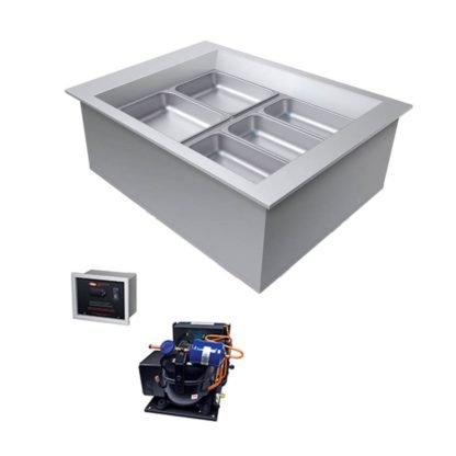 Drop-In Refrigerated Well, (2) pan size, top mount, electronic temperature control, auto defrost, pan support bars for full-size pans, sight glass, service valves, dryer/filter, insulated with 1″ drain, aluminized steel housing, stainless steel bezel, remote refrigeration, condensing unit, control panel and TXV valve (shipped loose), utilizes R-513A refrigerant, 1/4hp, UL, C-UL, 120v/60/1ph