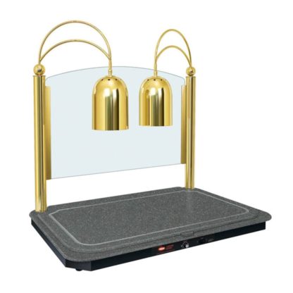 Decorative Carving Station with Two Heat Lamps (clear bulbs included), telescoping clearance (bottom of shade to cutting board) 14″ – 26″, 30¡ shade pivot, heated Swanstone base with thermostatic control, includes one 36″x24″ cutting board with meat juice containment, specify finish
