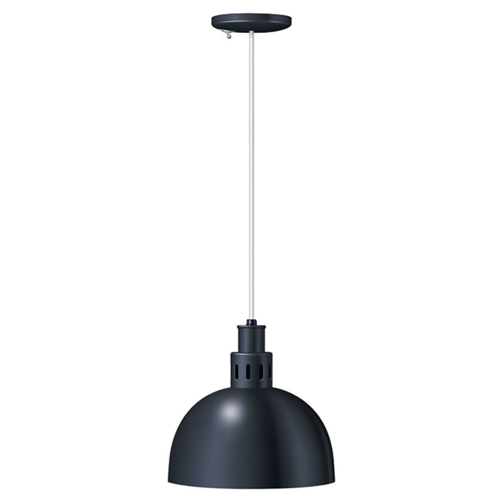 The Hatco DL-740-RL decorative heat lamp features a bold black material with a gloss finish for a distinguished appearance that matches common restaurant color themes. The shade measures 11 inches in diameter and 81/2 inches high while housing a lightbulb, which is sold separately. The maximum wattage for heating applications is 250 watts, and this unit works best for warming foods on kitchen work spaces and pickup stations.