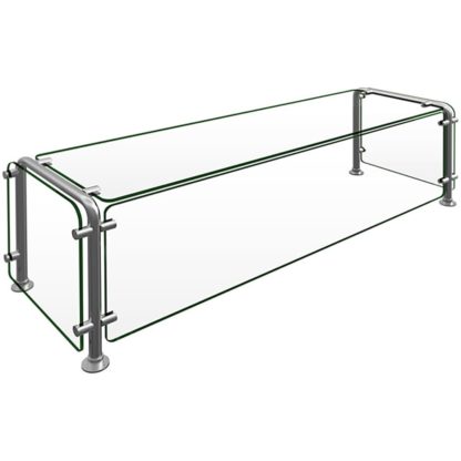 Flav-R-Shield ED20 Food Shield, full service, 48″W x 15″D x 18″H, mounted, heat tempered glass construction throughout with 3/4″ radius corners and polished edges, 3/8″ thick glass top shelf, front panel and side panels, 1″ OD brushed 304 stainless steel posts, NSF component, Made in the USA