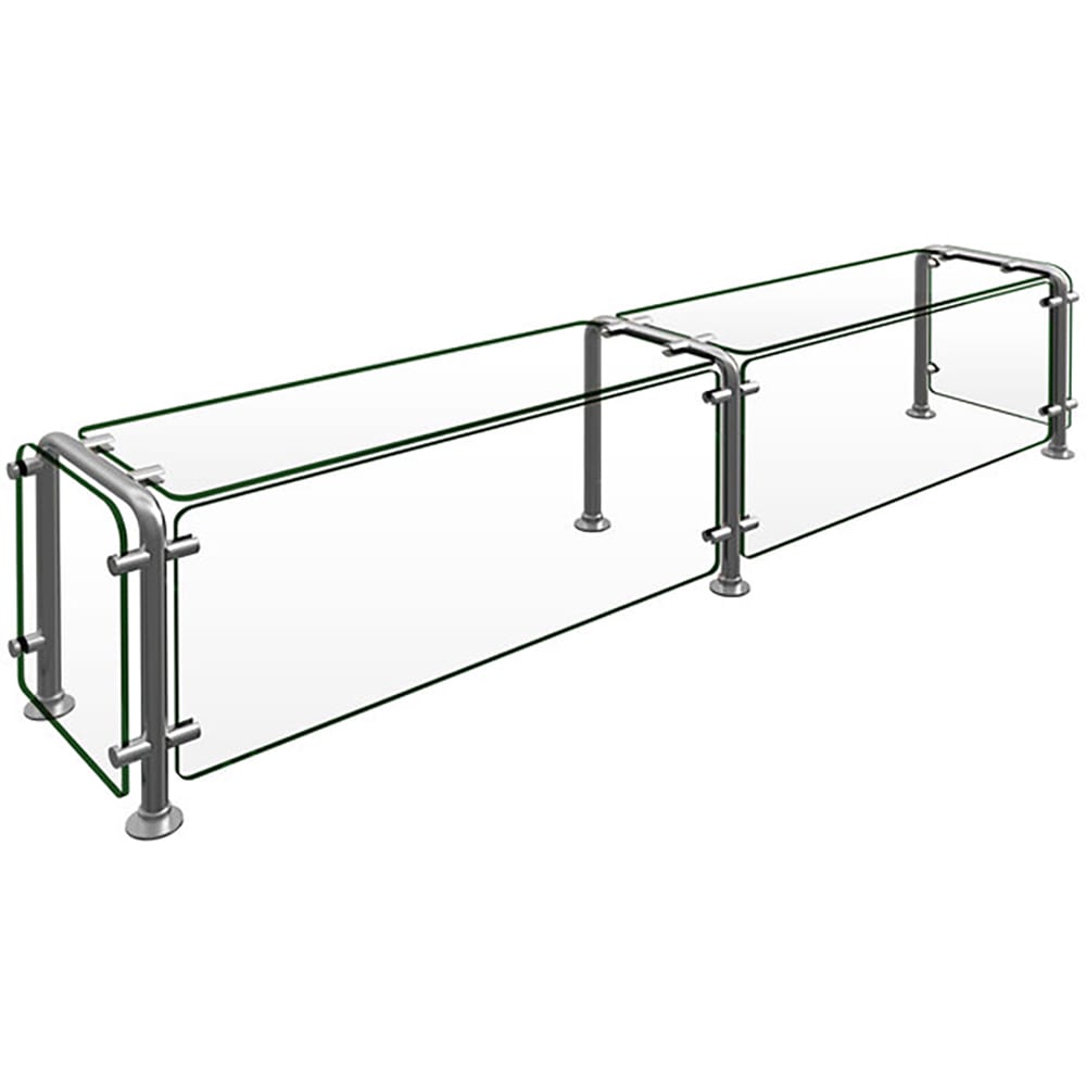 Flav-R-Shield ED20 Food Shield, full service, 60″W x 12″D x 18″H, mounted, heat tempered glass construction throughout with 3/4″ radius corners and polished edges, 3/8″ thick glass top shelf, front panel and side panels, 1″ OD brushed 304 stainless steel posts, NSF component, Made in the USA