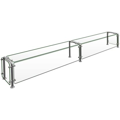 Flav-R-Shield ED20 Food Shield, full service, 96″W x 15″D x 18″H, mounted, heat tempered glass construction throughout with 3/4″ radius corners and polished edges, 3/8″ thick glass top shelf, front panel and side panels, 1″ OD brushed 304 stainless steel posts, NSF component, Made in the USA