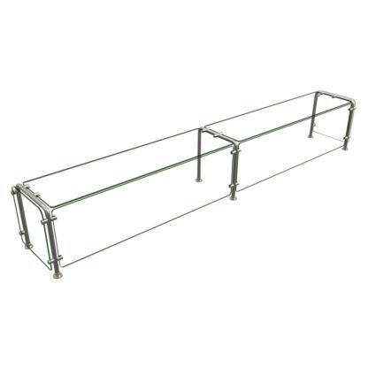 Flav-R-Shield ED20 Food Shield, full service, 108″W x 15″D x 18″H, mounted, heat tempered glass construction throughout with 3/4″ radius corners and polished edges, 3/8″ thick glass top shelf, front panel and side panels, 1″ OD brushed 304 stainless steel posts, NSF component, Made in the USA