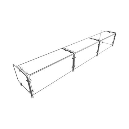 Flav-R-Shield EP11 Food Shield, full service, 108″W x 18″D x 18″H, mounted, 1/4″ thick heat tempered glass construction throughout with 3/4″ radius corners and polished edges, glass top shelf, front and side panels, 1″ OD brushed 304 stainless steel posts, NSF component, Made in the USA