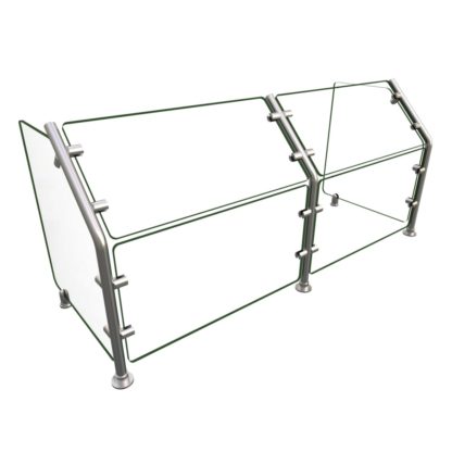 Flav-R-Shield EP36 Food Shield, full service, 48″W x 18″D x 22″H, heat tempered glass construction throughout with 3/4″ radius corners and polished edges, 1/4″ thick glass front and side panels, 1″ OD brushed 304 stainless steel posts, NSF component, Made in the USA