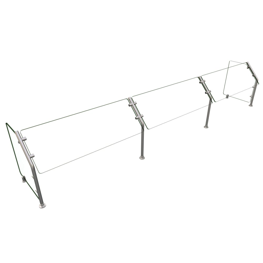 Flav-R-Shield ES31 Food Shield, self service, 120″W x 18″D x 22″H, heat tempered glass construction throughout with 3/4″ radius corners and polished edges, 3/8″ thick glass top shelf, 1/4″ thick glass front and side panels, 1″ OD brushed 304 stainless steel posts, NSF component, Made in the USA