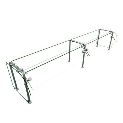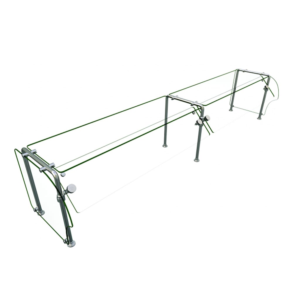Flav-R-Shield ES90 Food Shield, self-service, 108″W x 24″D x 22.63″H, heat tempered glass construction throughout with 3/4″ radius corners and polished edges, 3/8″ thick glass top shelf, adjustable front panel and side panels, 1″ OD brushed 304 stainless steel posts, NSF component, Made in the USA