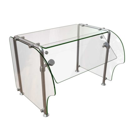 Flav-R-Shield ES90 Food Shield, self-service, 36″W x 24″D x 22.63″H, heat tempered glass construction throughout with 3/4″ radius corners and polished edges, 3/8″ thick glass top shelf, adjustable front panel and side panels, 1″ OD brushed 304 stainless steel posts, NSF component, Made in the USA