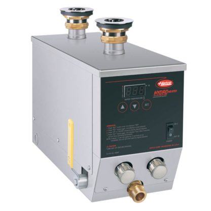 The Hatco FR2-3B Hydro-Heater bain marie heater is equipped with electronic temperature controls that can be adjusted from 140 to 190 degrees Fahrenheit to ensure bain maries and rethermalizers hold prepared foods at safe serving temperatures. Its digital display provides a readout for monitoring, while free-flow technology ensures the bain marie mounted above the heater warms efficiently. To prevent water from encountering heating elements-which could cause sediment and lime buildup- its spiral heating element is wrapped outside the tubular water chamber’s flow tube.