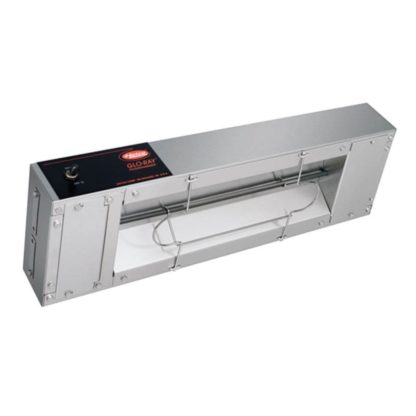 The Hatco GR-18 single-rod food warmer features a discrete, compact design, measuring 18 inches wide by 6 inches deep by 23/4 inches high to accommodate limited spaces. Safety measures for the Hatco GR-18 single-rod food warmer include a metal wire guard around its heating element and an easy-to-read built-in toggle switch that simplifies operation.